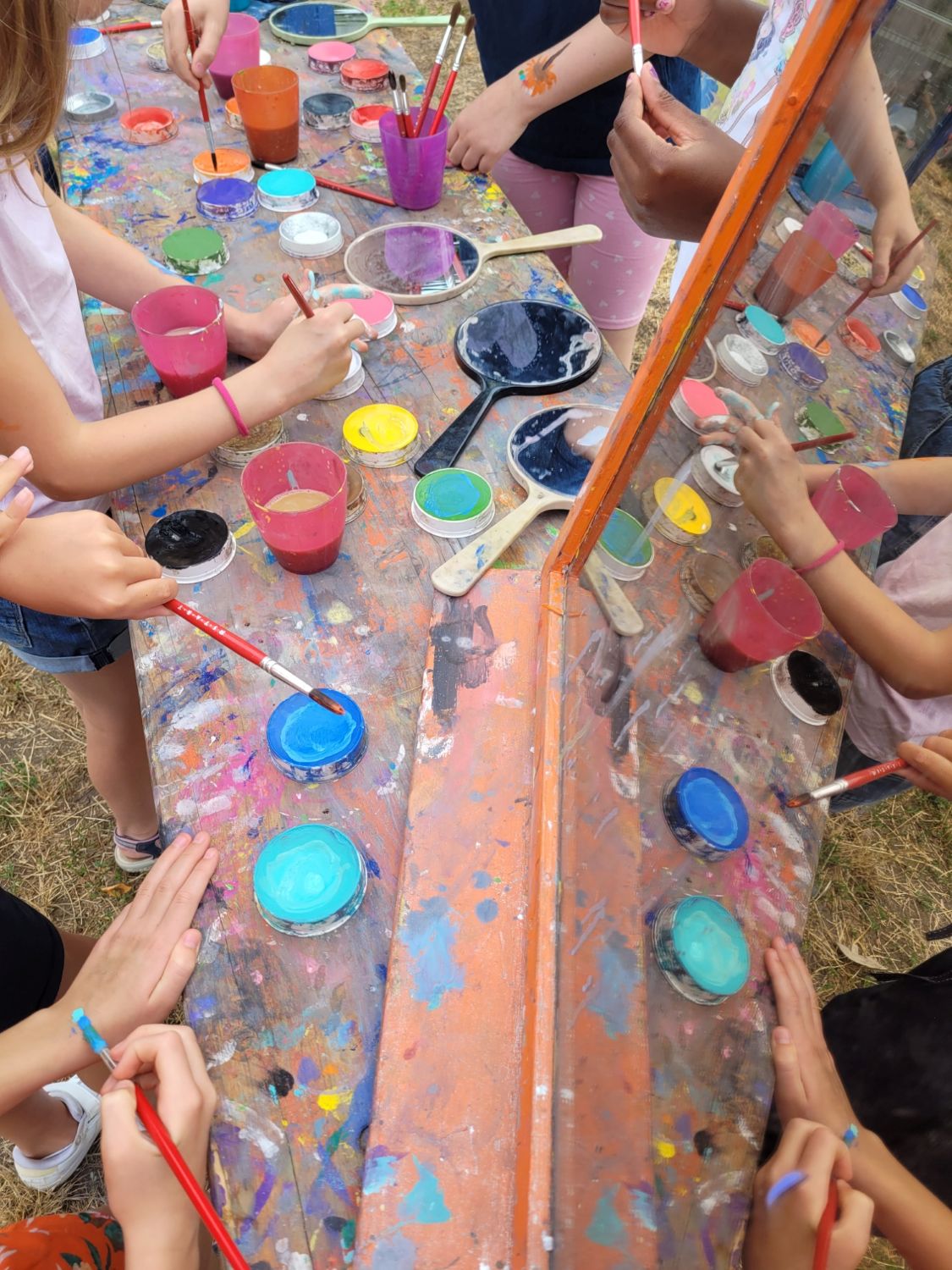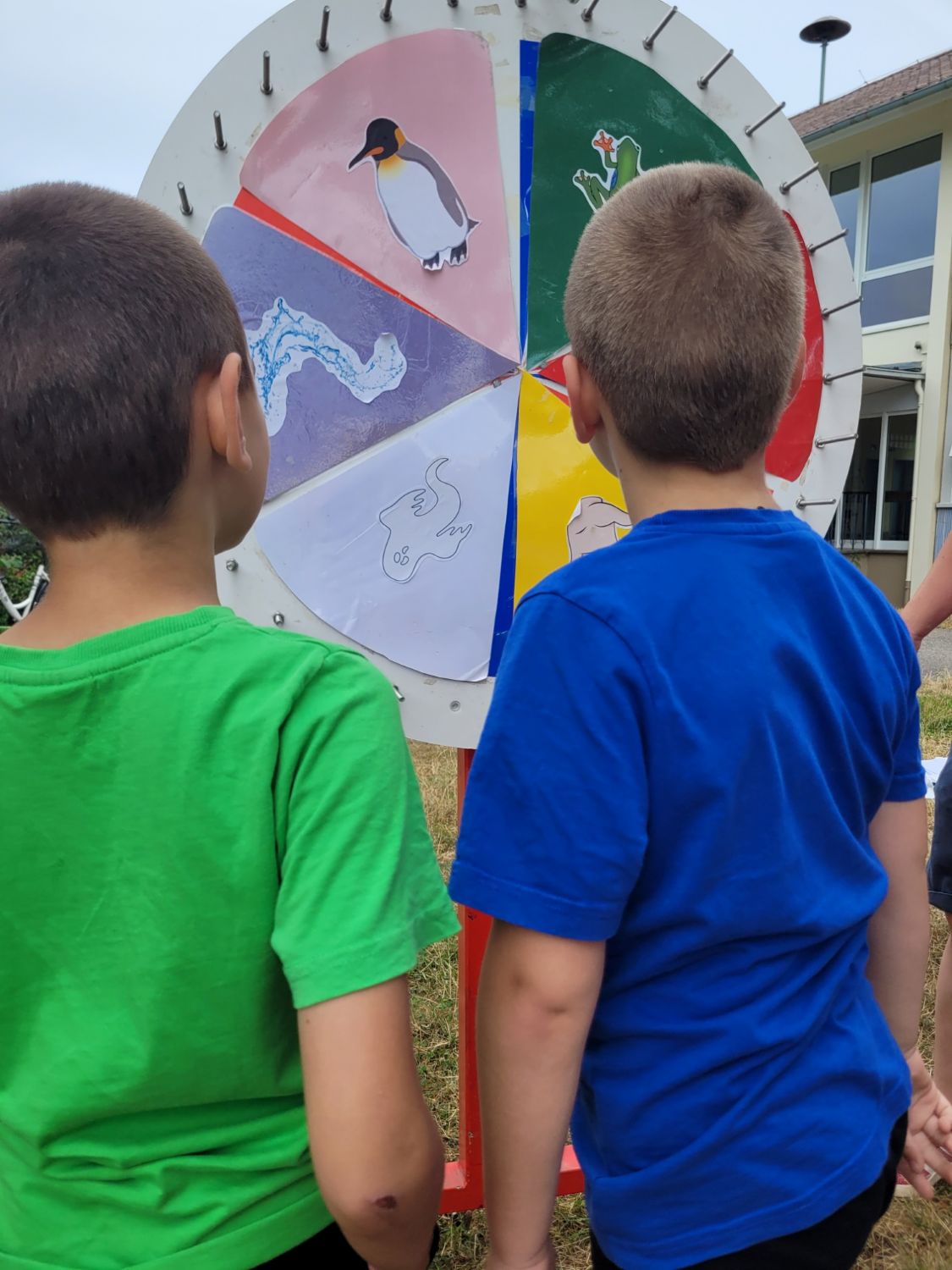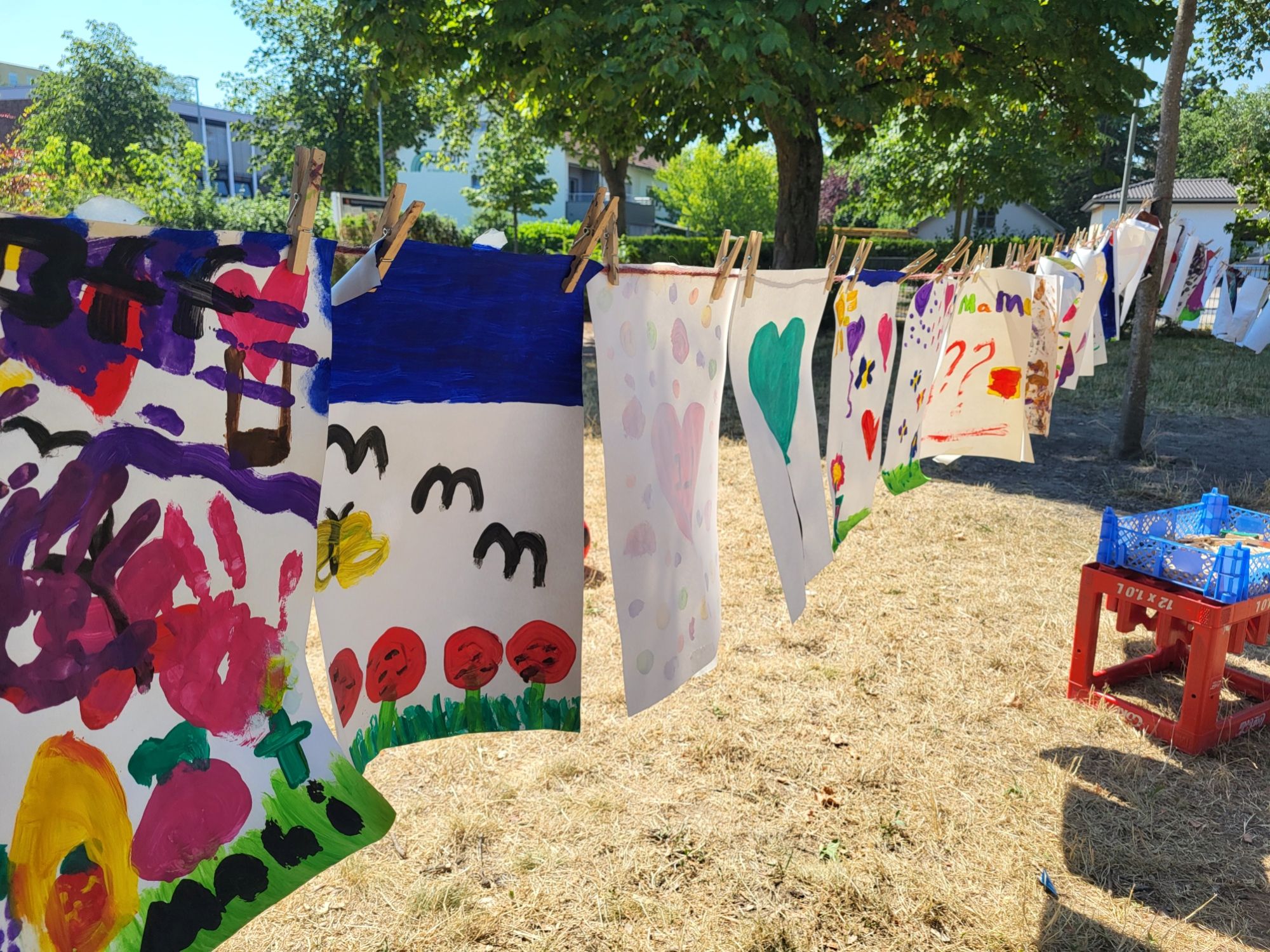 Um 8.35 Uhr war es dann an beiden Tagen soweit: 6 Grundschulklassen trafen sich auf dem Gelände zum gemeinsamen Beginn. Mit lustigen Bewegungsspielen im großen Kreis ging es los. Danach durften die Kinder sich aussuchen, welches Spiel- oder Bastelangebot sie wahrnehmen wollten. Und da gab es eine große Auswahl an Stationen: große Staffeleien mit Pinseln und bunten Farben, eine riesige Rollenrutsche, drei Trampoline, ein Glücksrad mit lustigen Treffern, ein Angebot zum Tonen, ein Tisch mit Spiegeln und Kinderschminke, eine gigantische Murmelbahn zum Aufbauen, ein Sprungturm mit einer Weichbodenmatte, Wikinger-Schach, ein Hockey Spiel mit Toren und verschiedene Brettspiele wie etwa Shuffle. Mit großer Freude und viel Spaß an der Bewegung probierten alle Kinder die verschiedenen Angebote aus. Die Mitarbeiter und Mitarbeiterinnen der Mobis standen helfend zur Seite und unterstützten, wo es nötig war. Bei den hohen Temperaturen am Mittwoch sorgte ein Wasserschlauch für die nötige Abkühlung. Und am Donnerstag war das Wetter mit etwas Wind und bedecktem Himmel für alle sehr angenehm. Leider ging dieser wunderbare und abwechslungsreiche Vormittag viel zu schnell vorbei und alle halfen beim Aufräumen der Materialien.